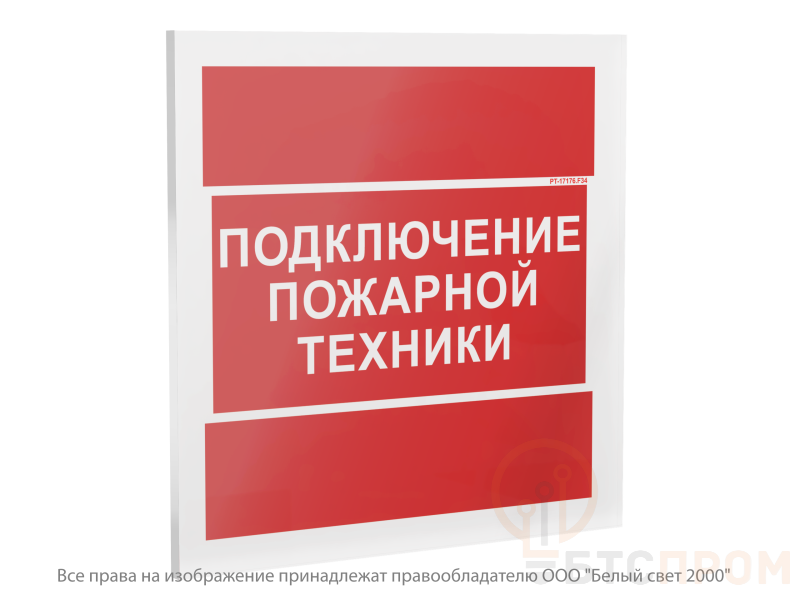 Знак безопасности PT-17176.F34 "Подключение пожарной техники" — это специализированная табличка, предназначенная для четкого обозначения мест подключения пожарного оборудования. Знак выполнен в белом цвете с контрастной черной пиктограммой и надписью, что обеспечивает его высокую видимость и быстрое распознавание даже в условиях плохого освещения или задымления.