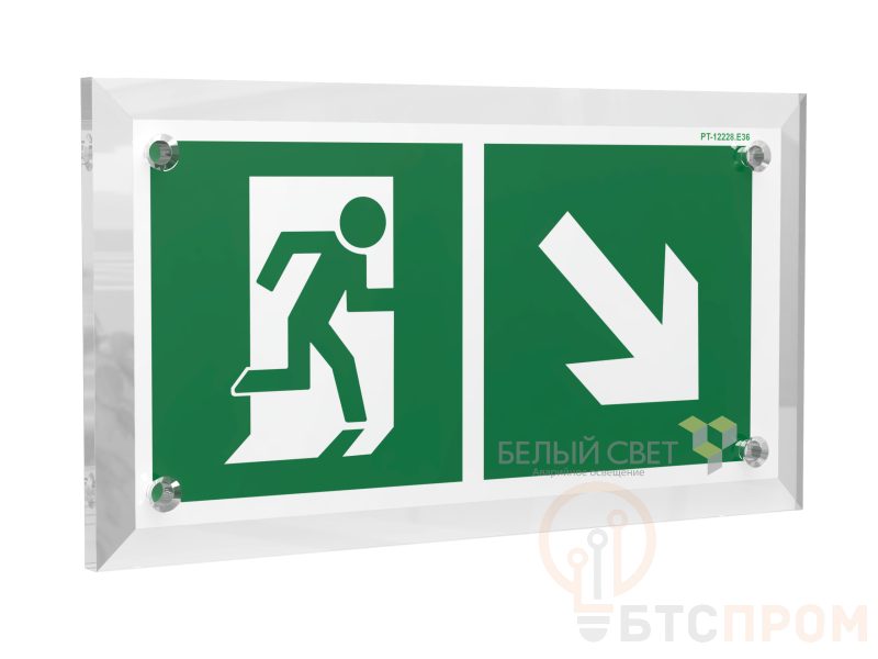 Знак безопасности "Направление к эвакуационному выходу направо вниз", габаритные размеры 320х170 мм, фактические размеры 300х150 мм, сигнальный цвет - зеленый, контрастный цвет - белый