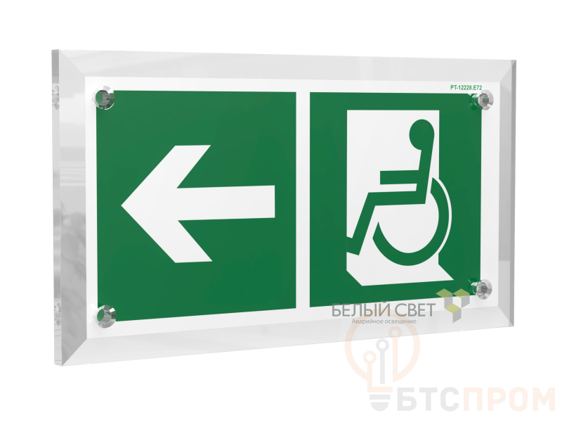 Знак безопасности "Направление движения к эвакуационному выходу МГН налево", габаритные размеры 320х170 мм, фактические размеры 300х150 мм, сигнальный цвет - зеленый, контрастный цвет - белый