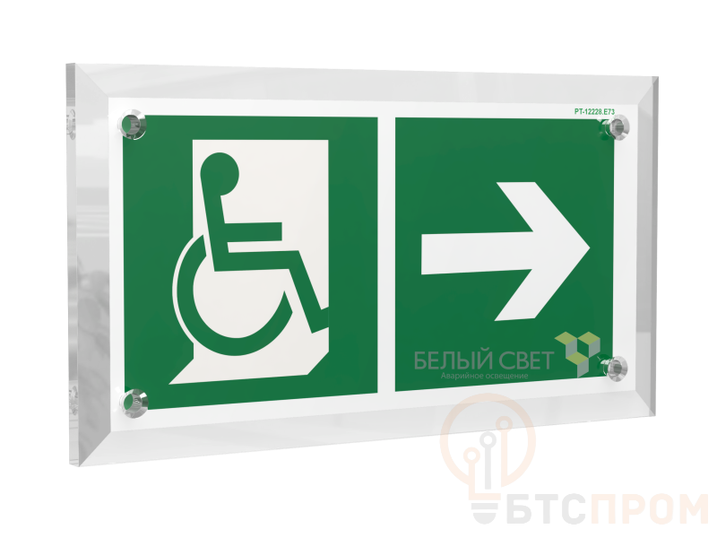 Знак безопасности "Направление движения к эвакуационному выходу МГН направо", габаритные размеры 320х170 мм, фактические размеры 300х150 мм, сигнальный цвет - зеленый, контрастный цвет - белый
