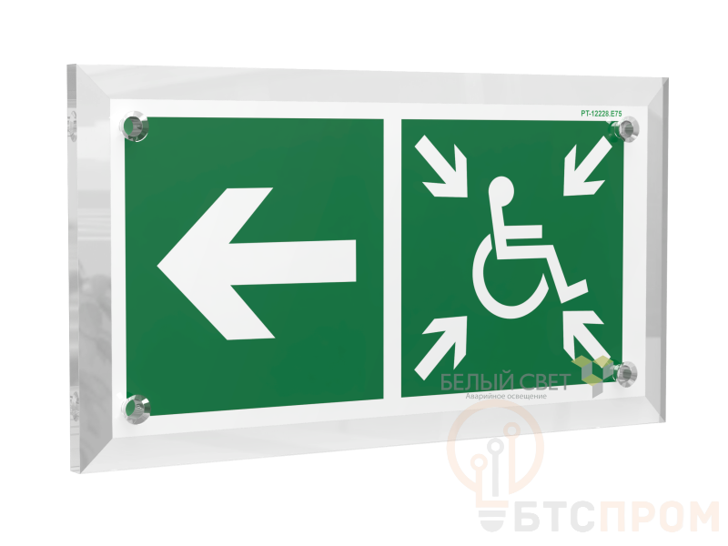 Знак безопасности "Направление движения к пункту сбора (безопасной зоне) МГН налево", габаритные размеры 320х170 мм, фактические размеры 300х150 мм, сигнальный цвет - зеленый, контрастный цвет - белый