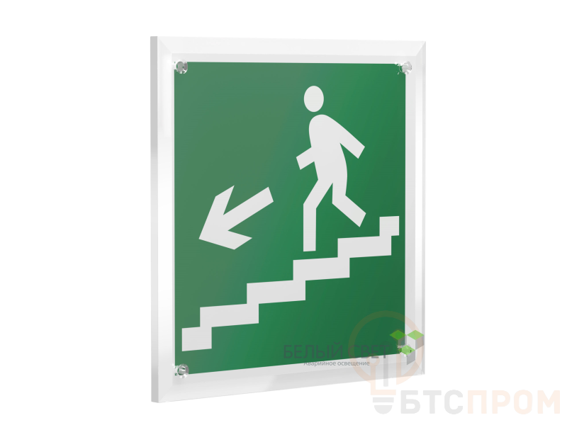 Знак безопасности "Направление к эвакуационному выходу по лестнице вниз", габаритные размеры 220х220 мм, фактические размеры 200х200 мм, сигнальный цвет - зеленый, контрастный цвет - белый