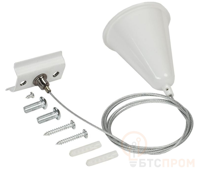 Комплект подвеса шинопровода регулируемый: скоба, колпачок, трос. Позволяет легко регулировать высоту установки шинопровода.