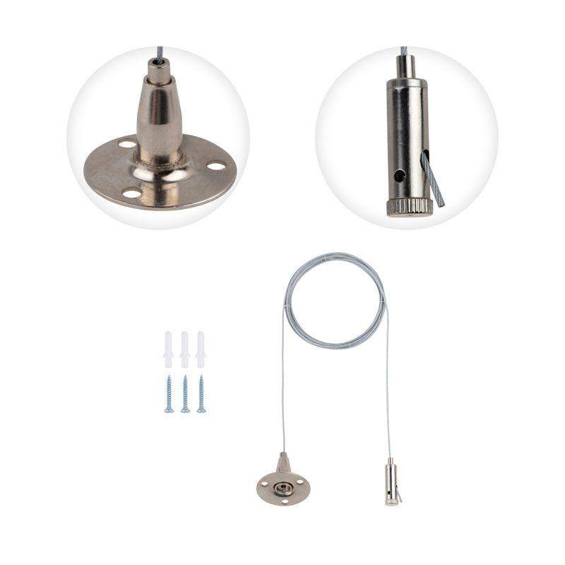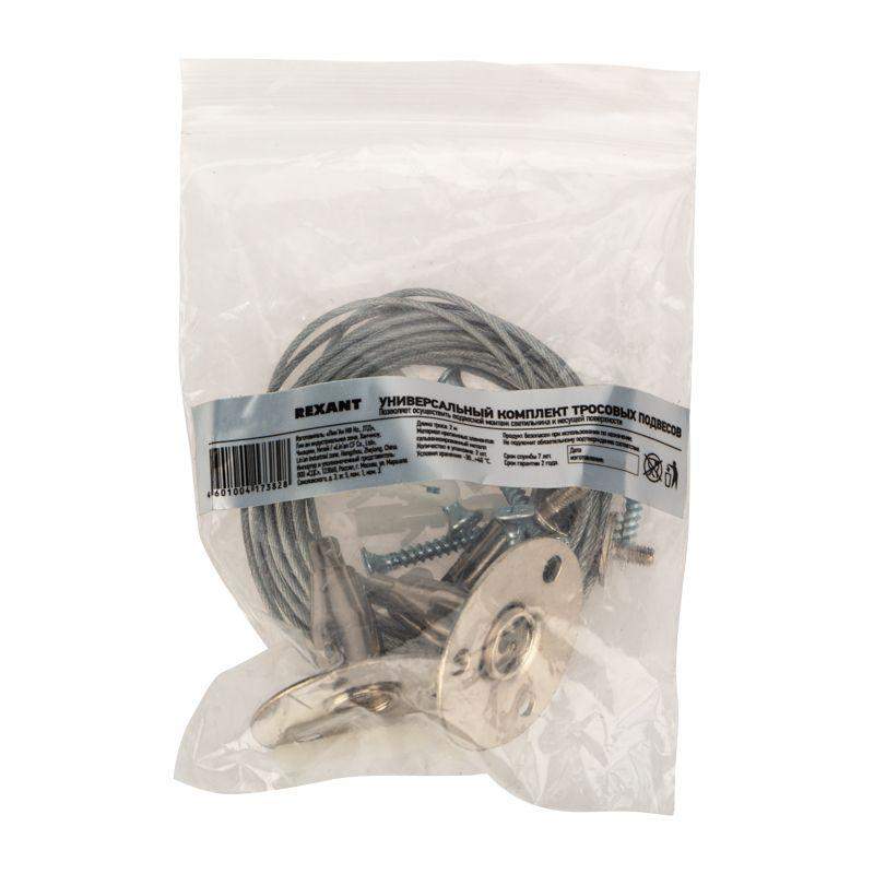Универсальный тросовый подвес REXANT предназначен для подвесного монтажа шинопроводов к потолку или несущим конструкциям. Трос изготовлен из стали и оснащен самозажимными держателями, посредством которых регулируется длина подвеса. Материал крепежных элементов – гальванизированный металл. В комплекте поставляются два троса, длина каждого составляет 2 метра.