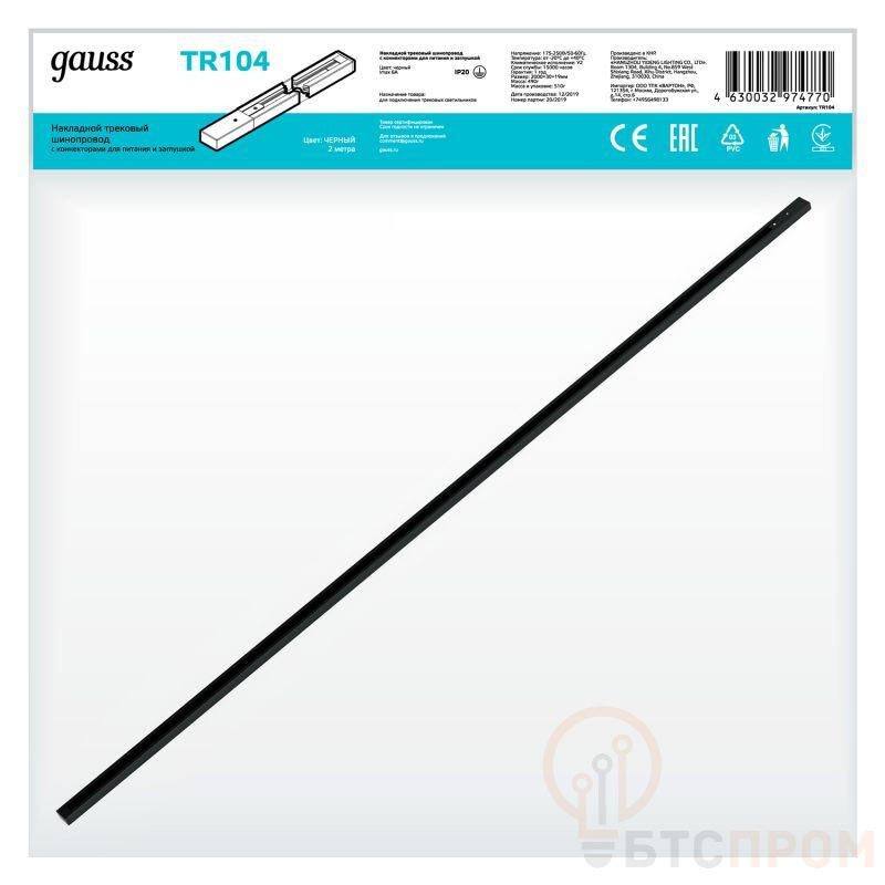 Шинопровод для однофазных трековых светильников на 2 провода. Коннектор питания и заглушка в комплекте. Максимальная нагрузка на шинопровод - 1000W