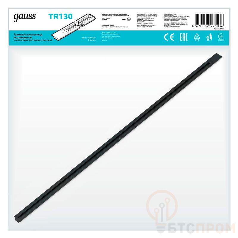 Шинопровод однофазный L2000 Track встраив. с адаптером питания и заглушкой черн. GAUSS TR130 фото в каталоге от BTSprom.by