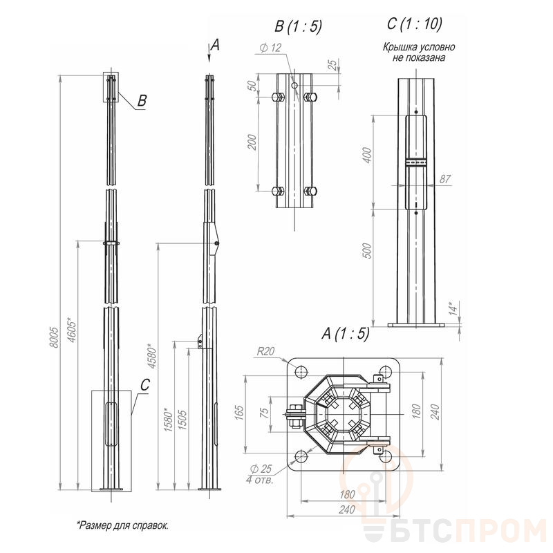 Опора ОГКс-8.0 (К240-180-4х25)-ц В00001866 от производителя "Пересвет" — это надежная наземная опора, предназначенная для монтажа и поддержания осветительного оборудования. Конструкция выполнена из высококачественной стали, обеспечивающей длительный срок службы и стойкость к агрессивным воздействиям окружающей среды. Характеризуется высотой 8.0 метров и имеет коническую форму (обозначение К240-180-4х25), что гарантирует оптимальную устойчивость и ветровую прочность. Для защиты от коррозии нанесено цинковое покрытие.