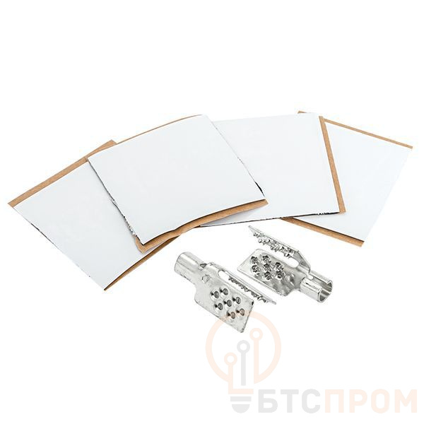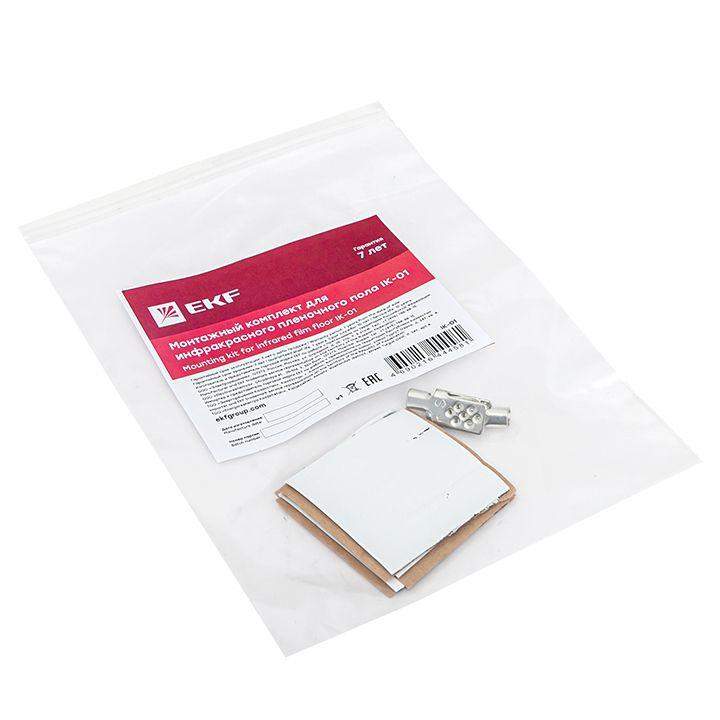Монтажный комплект IK-01 представляет собой готовое решение для подключения одной полосы инфракрасной нагревательной пленки. В комплект входят два контактных зажима и 6 отрезков бутил-каучуковой изоляции 50х50 мм.