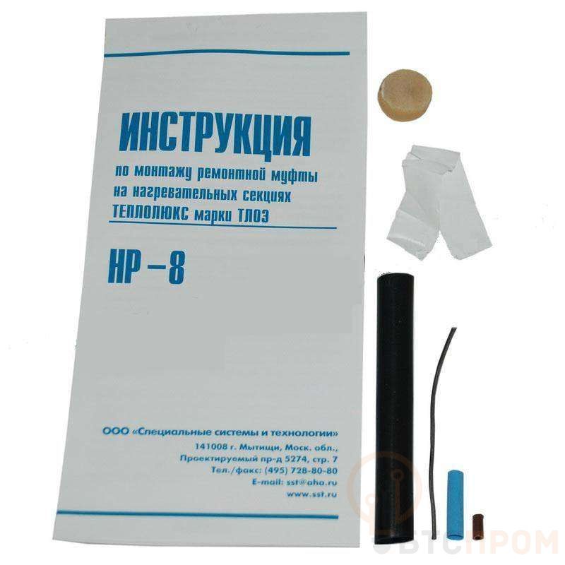 Комплект для ремонта нагревательных секций ТЕПЛОЛЮКС марки ТЛОЭ. Состав комплекта: Трубка термоусаживаемая Т2 4/2, L = 25 мм 1 шт. Трубка термоусаживаемая ТУТ 10/5, L = 100 мм 1 шт. Лента СКЛФ 4Д 1?0,8, L = 100 мм 1 шт. Трубка медная М3 4?1 1 шт. Герметик-клей КР-1Б (ГИПК14-13) 20 г Припой ПОС 61 Прв 1 2 г Инструкция по монтажу комплекта ремонтного НР-8 1 шт. Пакет с защелкой 15?22 1 шт. Стикер со штрих-кодом «Комплект ремонтный» 1 шт.