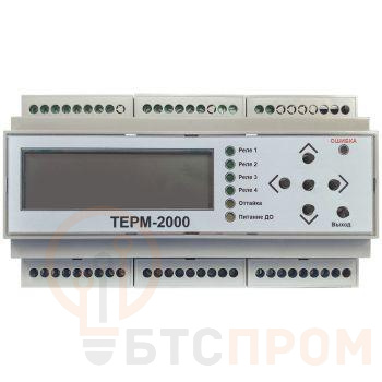 Программируемый терморегулятор ТЕРМ-2000 – это универсальный регулятор температуры, предназначенный для автоматического управления обогревом в составе систем антиобледенения кровли, лотков, желобов, водосточных труб, дорожек, пандусов, ступеней, обогрева трубопроводов и резервуарова, а также любых других систем кабельного электрообогрева. ТЕРМ-2000 управляет обогревом с помощью коммутации нагревательных кабелей через внешние контакторы. Терморегулятор ТЕРМ-2000 позволяет подключать цифровые и аналоговые датчики температуры воздуха и температуры поверхности, датчики осадков и воды для измерения соответствующих параметров: температуры окружающего воздуха, температуры поверхности обогрева, наличия атмосферных осадков и талой воды в водосточной системе. Регулятор оснащен жидкокристаллическим дисплеем для отображения текущего состояния работы системы и настройки параметров. ТЕРМ-2000 позволяет выбрать 1 из 4 алгоритмов работы в зависимости от типа обогреваемых объектов. При необходимости удалённого управления прибором можно подключить ТЕРМ-2000 к компьютеру (ПК) через интерфейс RS-485. Связь с ПК осуществляется по протоколу MODBUS RTU.
