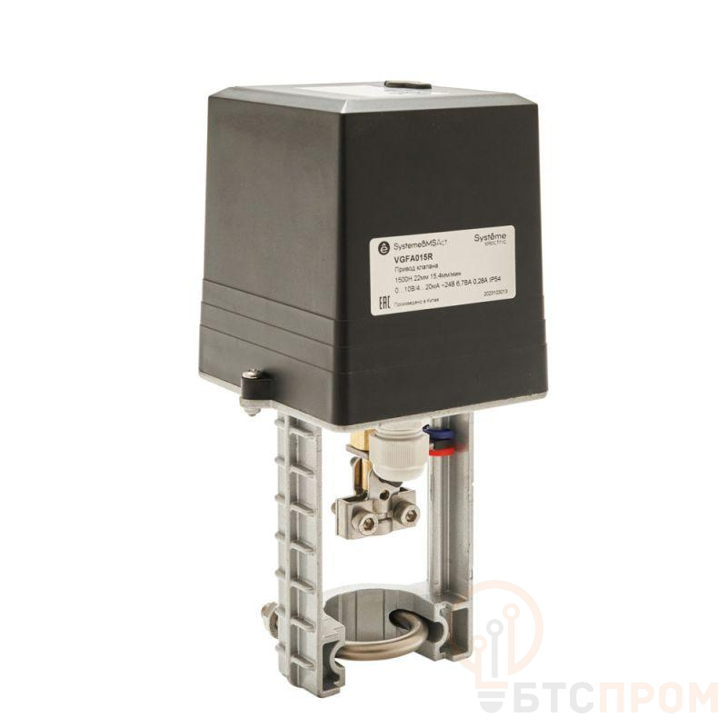 Привод электромеханический для 2-ходовых и 3-ходовых клапанов VGF, 1500Н, аналоговый сигнал управления 0…10 В или 4…20 мА, напряжение питания 24 В переменного тока, потребляемая мощность 6,7ВА, степень защиты корпуса IP54