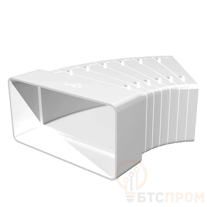 Колено плоское 55х110мм горизонтальное 511КРП изготовлено из пластика, который не меняет цвет и не подвержен старению. Материал обладает такими качествами как ударопрочность, стойкость к агрессивным щелочным и кислотным средам, атмосферным явлениям и относится трудновоспламеняемым материалам. Изделие выдерживает частые перепады температуры, контакт с жаром, влагой - этого достаточно, чтобы установить ее на кухне или в ванной комнате, где присутствуют данные факторы. Колено пластиковое Era 511КРП представляет из себя ничто иное, как фасонный элемент воздуховода плоской формы, обеспечивающий всевозможные перемены в направлении потока воздушных масс. Для соединения воздуховодов соответствующего сечения под углом от 3° до 48°. В зависимости от выбранного угла одна сторона соединителя подрезается. C каналами соответсвующего сечения соединяются напрямую.
