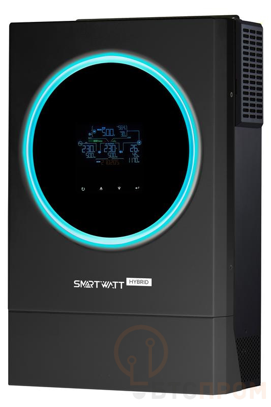 Однофазный гибридный инвертор SMARTWATT HYBRID 5.6K Имеет один высоковольтный MPPT контроллер, порт для BMS, Wi-Fi. Может работать без АКБ. Максимальная мощность от ФЭМ - 6000 Вт. Максимальное входное напряжение от ФЭМ - 450 Вольт.