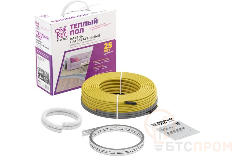 "Теплый пол «OneKeyElectro» на основе нагревательного кабеля может применяться как для основного, так и для комфортного обогрева помещения, устанавливается в стяжку 3-5 см или в слой плиточного клея 5-8 мм под любое напольное покрытие: ламинат, линолеум, керамическая плитка, керамогранит. Прессованная муфта обеспечивает надежное соединение установочного провода и нагревательного кабеля. Увеличение мощности достигается путем уменьшения шага раскладки кабеля. Шаг укладки (см) = (100?S)/L, S – обогреваемая площадь, м2; L – длина нагревательного кабеля, м. Область применения: гостиная, кухня, балкон, коридор, ванная комната, столовая, детская комната."