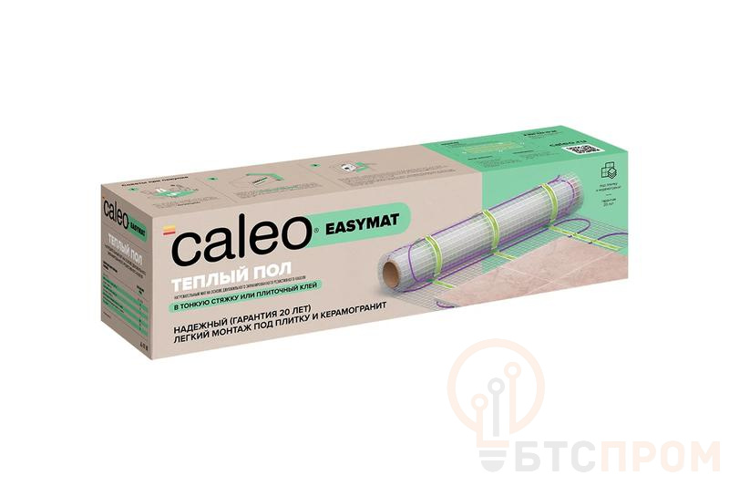 Характеристики Caleo Easymat · 140 Вт/кв.м — для стандартных помещений, для комфортного обогрева · Толщина нагревательного кабеля — 4 мм · Двойная изоляция: нагревательных жил — ТПЕЕ, внешняя — ПВХ · Защитный экран — из алюминиевой фольги с дренажным проводником · Гарантия — 20 лет Особенности нагревательного мата от Caleo · Предназначен для монтажа в тонкую стяжку, плиточный клей или наливной пол. · Обеспечивает подогрев поверхности пола для создания как комфортного, так и основного обогрева. · Удобная, с постоянным шагом раскладка кабеля на сетке позволяет осуществить легкий и быстрый монтаж термомата на любых поверхностях, даже сложных конфигураций. · Идеально подходит для ванных комнат и других влажных помещений. Комплектация Caleo Easymat · Термомат в рулоне. · Гофротрубка с заглушкой. · Паспорт изделия, инструкция, гарантийный талон.