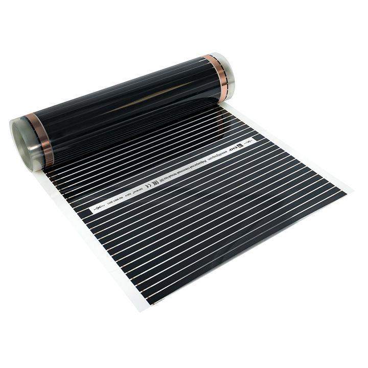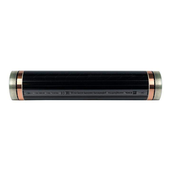 Пленочный теплый пол EKF применяется для сухого монтажа без стяжки не только при капитальном ремонте, но и при косметическом. Толщина пленки -0,338 мм. Обеспечивает быстрый и легкий монтаж. Идеально подходит для укладки под ламинат, паркетную доску, мягкое напольное покрытие: линолеум, ковролин. Инфракрасный пленочный теплый пол состоит из следующих элементов. Полосы углеродного материала шириной около 1,5 см соединены между собой при помощи медных шин с серебряным покрытием, которые и проводят электрический ток. Нагревательный элемент заламинирован с двух сторон плотным полимером, который не задерживает инфракрасное излучение и обеспечивает отличную защиту от попадания влаги, пробоев и возгорания.