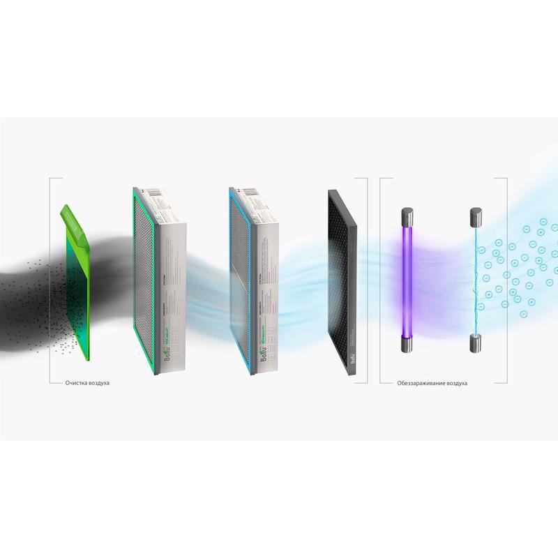 Ballu ONEAIR ASP-200P MAX – инверторный приточный очиститель воздуха с интеллектом. Предназначен для подачи свежего и очищенного воздуха в любые жилые помещения площадью до 75 кв.м. Встроенный высокоэффективный керамический нагревательный элемент мощностью 1200 Вт подогревает входящий воздух. При этом прибор эффективно работает в осенне-зимний период при температуре наружного воздуха до -40С. Профессиональная система очистки воздуха, состоящая из 6 ступеней, устраняет 99,9% загрязнений в воздухе, поглощает неприятные запахи, обеззараживает от вирусов и бактерий. В приборе есть арома-капсула для масел, позволяющая создать индивидуальную атмосферу на любой вкус. Встроенный датчик РМ2,5 в зависимости от качества воздуха, автоматически управляет интенсивностью очистки в режиме циркуляции. Датчик CO2 контролирует уровень углекислого газа в помещении и автоматически управляет клапаном притока, поддерживая оптимальный уровень CO2. Прибор имеет удобный интерфейс, который обеспечивают цветной дисплей и полифонический звуковой сигнал, встроенный Wi-Fi модуль для удаленного управления прибора с мобильных устройств, пульт ДУ в комплекте.