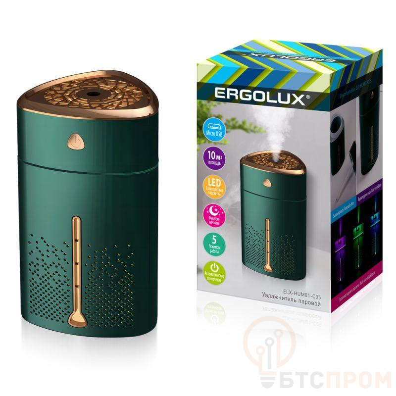 Ультразвуковой увлажнитель воздуха. Резервуар 1000 мл Мощность 5 Вт Входное напряжение 5В/1А Длина провода 60 см Тип подключения устройства: проводное Источник питания: сеть Уровень шума 10-30 дБ Расход воды 100 мл/час 5 режимов работы Бесшумный Подсветка Функция ночника Интенсивное увлажнение Макс. площадь помещения 10 кв.м Можно использовать ароматическое масло Автоматическое отключение при нехватке воды Может работать от Power Bank! Для надежной и корректной работы, рекомендуется использовать аксессуары ERGOLUX.