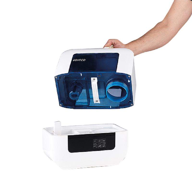 "Увлажнитель Boneco U700 создает и поддерживает оптимальный уровень влажности в помещении (40-60%), и работает в 2-х режимах увлажнения - «холодный» или «теплый» пар. ...для экологии дома Микроклимат в доме следует поддерживать в параметрах, максимально приближенных к здоровой и чистой атмосфере. Оптимальным уровнем влажности в помещении считается влажность 40-60%. ...для ухода за мебелью Boneco U700 создаст оптимальные условия в помещениях, где представлены антикварные предметы, музыкальные инструменты или деревянные напольные покрытия (паркет, паркетная доска). Опасность сухого воздуха кроется в том, что низкая влажность воздуха приводит к рассыханию деревянных деталей, появлению трещин и деформации элементов из дерева. Регулярное поддержание рекомендованного уровня влажности в помещении помогает избежать порчи древесины, посторонних скрипов и других неприятных последствий. ...забота о растениях Экзотические растения весьма требовательны к влажности в помещении, и требуют к себе особенного бережного отношения. Несоблюдение этих условий приводит к чахлости и высыханию растений. Поддерживать рекомендованные для растений климатические условия Вам поможет увлажнитель Boneco U700. Ваша оранжерея будет радовать Вас круглый год. Принцип работы: В работе ультразвуковых увлажнителей используется интересный физический эффект: внутри корпуса прибора установлена мембрана, которая вибрирует в ультразвуковом диапазоне, разбивая воду в мельчайшие капли. Через рабочую камеру прибора вентилятором прогоняется воздух. Таким образом, прибор генерирует облако «тумана». Ультразвуковой увлажнитель Boneco U700 имеет высокую производительность по увлажнению — до 600 г/ час, 2 режима увлажнения - «холодный» или «теплый» пар, капсулу для ароматических масел и информативный дисплей , с функцией авто затемнения (индикация в зависимости от уровня освещения становится ярче или тусклее). Когда в приборе заканчивается вода или необходимо провести процедуру очистки, на дисплее загорается индикатор, подсказывающий Вам – что нужно сделать. Технология очищения и обеззараживания воды: Чтобы сделать процесс эксплуатации увлажнителя максимально простым и использовать водопроводную воду для увлажнения, во всех ультразвуковых увлажнителях Boneco предусмотрен фильтр - картридж с ионообменной смолой, срок службы которого до 8 месяцев (в зависимости от качества заливаемой в прибор воды и частоты использования прибора). Функция предварительного нагрева воды до 80°С (пастеризация) обеспечивает полное очищение воды от болезнетворных микробов и бактерий. Помощь серебра: Ультразвуковой увлажнитель Boneco U700 укомплектован ионизирующим серебряным стержнем Ionic Silver Stick (ISS) (в комплекте). Серебряный стержень ISS обеспечивает эффективное обеззараживание воды и уничтожение всех видов болезнетворных микроорганизмов (бактерий, вирусов и др.). Срок службы стержня ISS составляет до 12 месяцев. При необходимости его можно приобрести отдельно. Замена фильтров-картриджей: Для увлажнения в прибор можно заливать водопроводную воду - во всех ультразвуковых увлажнителях Boneco предусмотрен фильтр – картридж, очищающий воду от солей жесткости. Срок службы фильтра-картриджа составляет 2–4 месяца и зависит от качества водопроводной воды и частоты пользования прибором. Удобным решением для потребител