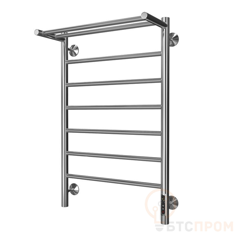 Классическая модель электрического полотенцесушителя тип "лесенка с полкой" симметрично расположенными прямыми перекладинами. Особенностью полотенцесушителя является полка, через которую проходит нагревательный контур, поэтому нагрев происходит равномерно, а температура поверхности одинакова по всему периметру прибора.