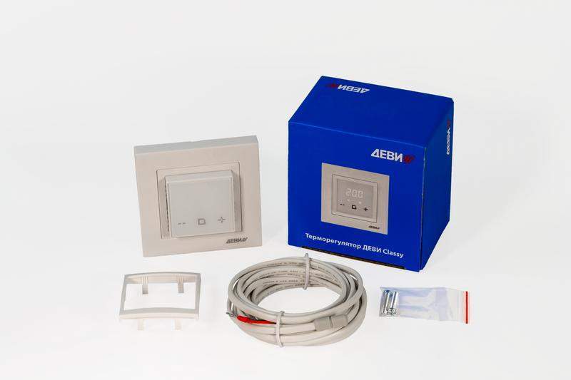 ДЕВИ Classy – электронный программируемый терморегулятор с датчиком температуры на проводе и встроенным Wi-Fi модулем. Терморегулятор предназначен только для стационарной установки внутри помещений. Терморегулятор имеет следующие особенности: LED дисплей с возможностью регулировки яркости подсветки; возможность управления через приложение Warmme или Tuya Smart Life на смартфоне или с помощью сенсорных кнопок на дисплее терморегулятора; два варианта настройки расписания: индивидуальное расписание для каждого дня недели; одинаковое расписание для будних дней и индивидуальное для субботы и воскресенья; функция адаптации (заблаговременное включение системы обогрева для достижения требуемой температуры к началу каждого периода времени); функция «в отъезде»; режим поддержания заданной температуры; функция блокировки кнопок от случайного нажатия; учет энергопотребления (в приложении); функция защиты от замерзания; интеграция с системой «умный дом»; встроенная система контроля исправности датчика температуры пола; в комплект входят 2 адаптера для рамок.