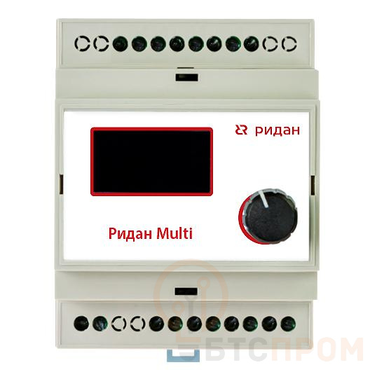 Ридан Multi — это универсальный электронный терморегулятор с четырьмя независимыми каналами управления, каждый из которых может быть настроен в соответствии с нужным режимом. Четыре режима работы каналов: Режим «КРОВЛЯ» — включение системы обогрева в заданном диапазоне от -20 до 15 °С. Если измеренная температура находится в заданном диапазоне, реле замкнуто. Используется датчик температуры тип NTC 10K. Режим «ОБОГРЕВ» — автоматическое поддержание заданной температуры нагрева до 45 °C. Используется датчик температуры тип NTC 10K. Режим «В.ТЕМП» (высокотемпературный нагрев) — автоматическое поддержание заданной температуры нагрева до 120 °С. Используется высокотемпературный датчик тип NTC 100K. Режим «ОХЛАЖДЕНИЕ» — автоматическое поддержание заданной температуры охлаждения до -35 °C. Используется датчик температуры тип NTC 10K. Предназначен для управления кабельными системами обогрева (теплый пол, обогрев кровли, обогрев внешних площадок, морозильных камер, трубопроводов, емкостей) и холодильными установками. Терморегулятор устанавливается в шкаф управления на рейку DIN. Поставляется в комплекте с датчиком температуры на проводе NTC 10К. Терморегулятор имеет следующие особенности: ЖК дисплей с индикацией режимов работы; удобное программирование и управление с помощью энкодера; индикация неисправностей с расшифровкой на дисплее.