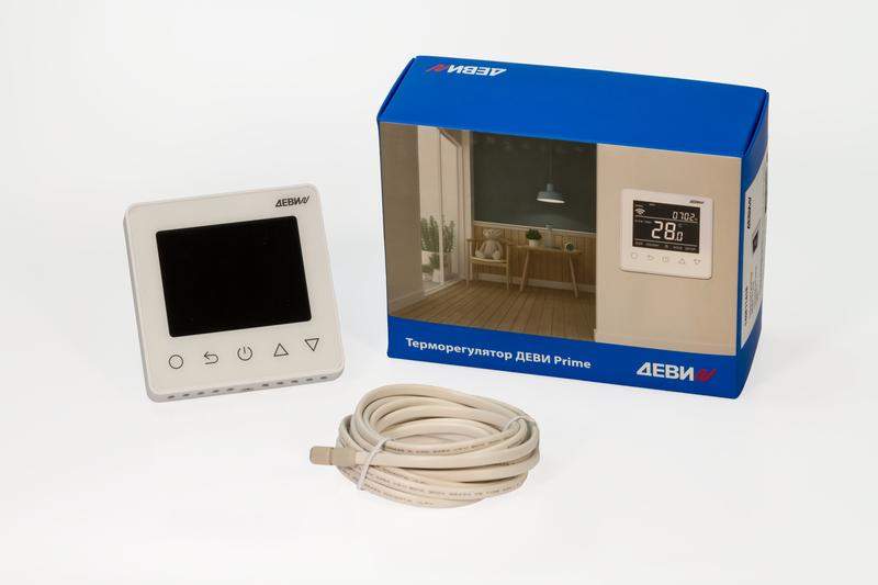ДЕВИ Prime – это электронный программируемый терморегулятор со встроенным датчиком температуры воздуха и датчиком температуры пола на проводе с возможностью управления через Wi-Fi. Предназначен для управления электрическими системами комфортного подогрева пола или системами полного отопления помещений. С помощью приложения Warmme или Tuya Smart Life, установленного на смартфоне, можно задавать расписание работы системы, устанавливать различные температурные режимы и тем самым сокращать затраты на электроэнергию. Настройка возможна также с помощью сенсорных кнопок на терморегуляторе. Благодаря интеграции в программу умного дома Smart Life, поддерживает голосовое управление с помощью Amazon Alexa, Google Assistant и Яндекс Алиса. Терморегулятор предназначен только для стационарной установки внутри помещений. Терморегулятор имеет следующие особенности: ЖК дисплей с подсветкой и индикацией времени и дня недели; 4 периода работы на каждый день недели с возможностью установки температуры для каждого периода; функция адаптации (заблаговременное включение системы обогрева для достижения требуемой температуры к началу каждого периода времени); выбор датчика температуры (воздух/пол/воздух+пол); режим «в отъезде»; режим поддержания постоянной температуры; функция блокировки кнопок от случайного нажатия; учет энергопотребления (в приложении); ограничение температуры пола; интеграция с системой «умный дом»; встроенная система контроля исправности датчика температуры воздуха и датчика температуры пола.
