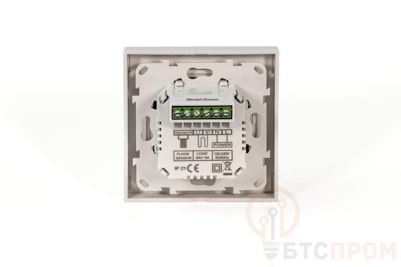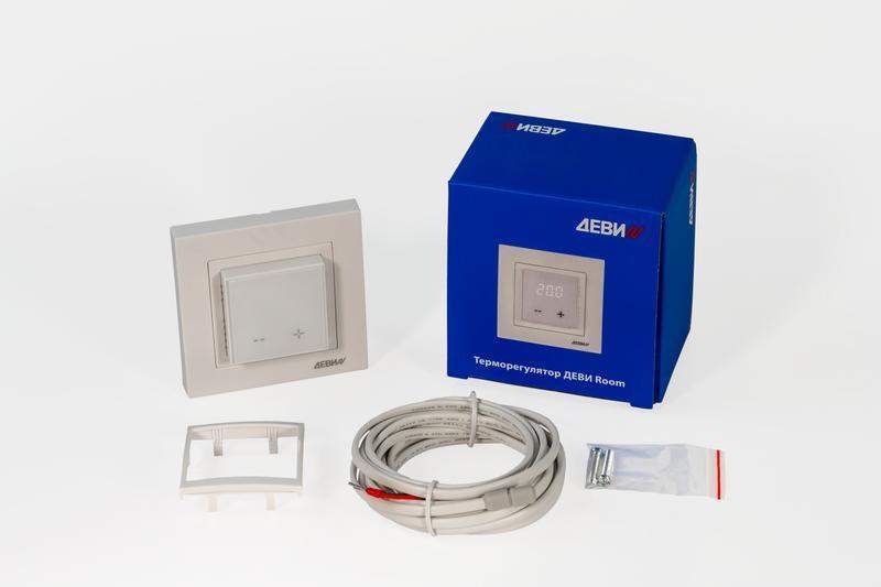 ДЕВИ Room – электронный терморегулятор с датчиком температуры на проводе, предназначенный для управления электрическими системами комфортного подогрева пола. Терморегулятор имеет следующие особенности: LED дисплей с возможностью регулировки яркости подсветки; простая настройка температуры пола с помощью сенсорных кнопок управления; постоянное поддержание заданной температуры (без задания программ); функция блокировки кнопок от случайного нажатия; функция защиты от замерзания; встроенная система контроля исправности датчика температуры пола; в комплект входят 2 адаптера для рамок. Терморегулятор предназначен только для стационарной установки внутри помещений.