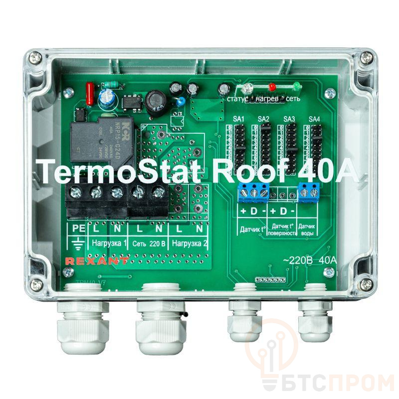 Терморегулятор TermoStat Roof предназначен для автоматизации обогрева элементов крыши (лотков, желобов, водосточных труб и т. п.). Устройство поддерживает заданную температуру по датчику температуры воздуха в диапазоне от -50 до +10 градусов. Морозостойкая и герметичная конструкция прибора серии TermoStat позволяет устанавливать его непосредственно у обогреваемого объекта и эксплуатировать в тяжелых условиях окружающей среды. В комплекте терморегулятор TermoStat Roof 40A и датчик температуры Temp С-2.