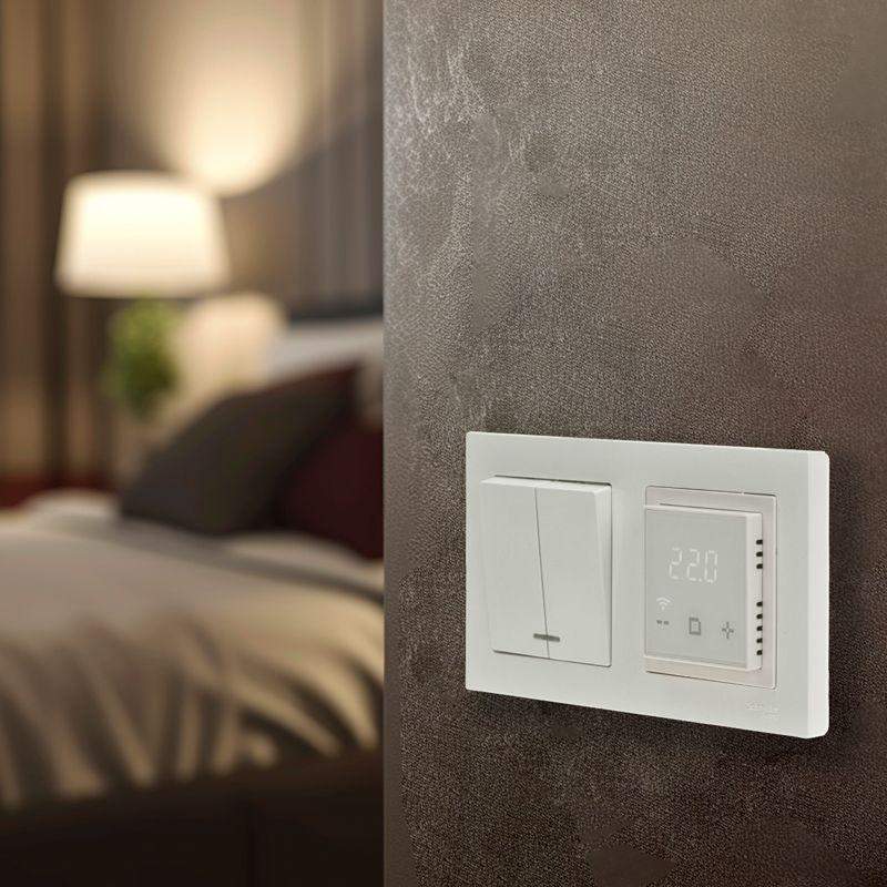 Цифровой терморегулятор RX-44W REXANT разработан для точного контроля температуры пола с максимальной нагрузкой 3500Вт/16А. Отличается высоким качеством и надежностью. Обеспечивает регулировку температуры в диапазоне от +5°C до +50°C. Управление устройством можно осуществлять через приложение на вашем смартфоне. Степень защиты IP21 подразумевает использование изделия в сухих отапливаемых помещениях. Принцип работы заключается в регулировке температуры пола с помощью электронной системы. Устройство обеспечивает комфортную температуру в помещении благодаря высокой точности и надежности. Терморегулятор выполнен в строгом и минималистичном дизайне. Может быть встроен в популярные серии электроустановки, внутренний размер которых составляет 56х56 мм. Бренд и серия электроустановки: JUNG: A-Creation, A-550, AS-500, A-Flow, Eco Profi, Eco Profi Standart, Eco Profi Deco; Schneider Electric: Atlas Design (модернизация механическая), Unica New, Exxact; GIRA: Standart 55 (модернизация механическая); Merten: System M (модернизация механическая); ABB: Basic 55; Legrand: Valena.