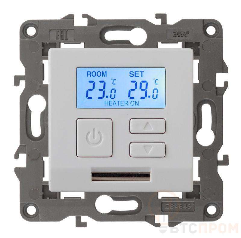 Терморегулятор теплый пол / отопление электронный серии Эра Elegance цвет белый 14-4111-01. Рамки приобретаются отдельно. Рамки Эра Elegance ПЛАСТИК: 1 пост 14-5001-хх, 2 поста 14-5002-хх, 3 поста 14-5003-хх, 4 поста 14-5004-хх, 5 постов 14-5005-хх; СТЕКЛО: 1 пост 14-5101-хх, 2 поста 14-5102-хх, 3 поста 14-5103-хх, 4 поста 14-5104-хх; МЕТАЛЛ: 1 пост 14-5201-хх, 2 поста 14-5202-хх, 3 поста 14-5203-хх, 4 поста 14-5204-хх; ДЕРЕВО: 1 пост 14-5301-хх, 2 поста 14-5302-хх, 3 поста 14-5303-хх, 4 поста 14-5304-хх (хх - код цвета: 00-прозрачный, 01-белый, белёный дуб, 02-слоновая кость, 03-алюминий, 04-шампань, 05-чёрный, чёрное дерево, 07-ясень, 09-дуб, 10-венге, 11-клён, 14-медь, 21-жёлтый, 22-оранжевый, 23-красный, 25-бордо, 26-лайм, 27-зелёный, 28-голубой, 29-синий, 30-розовый, 31-мокко, 32-серый, 41-сталь, 42-титан).