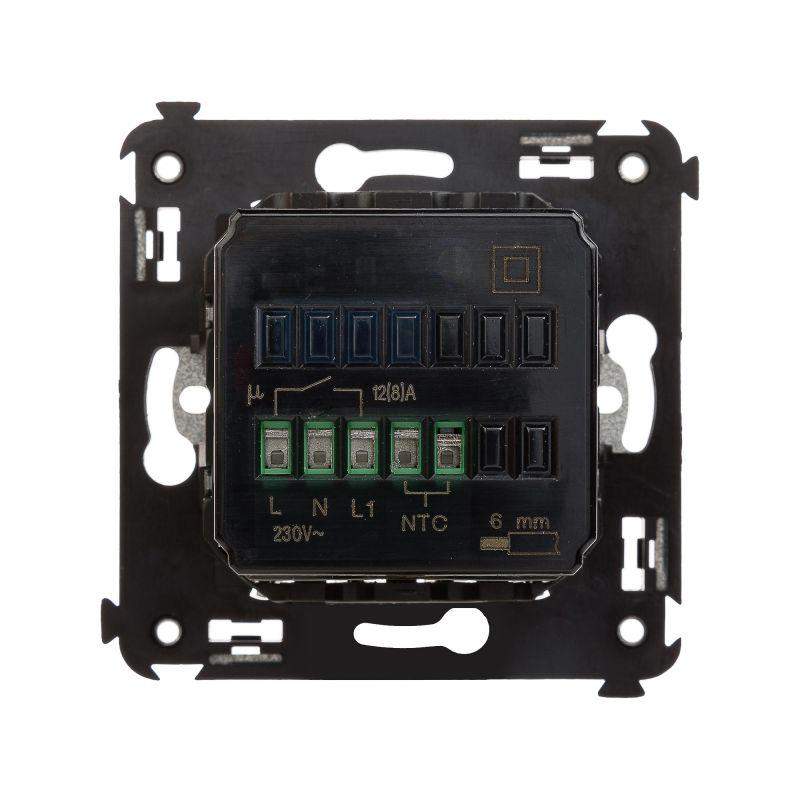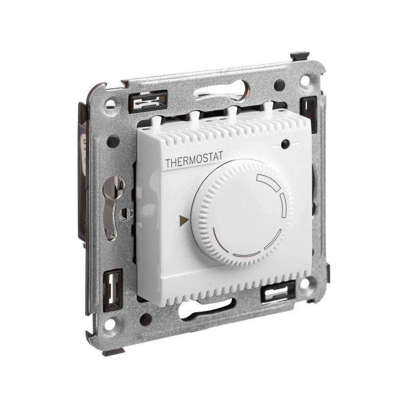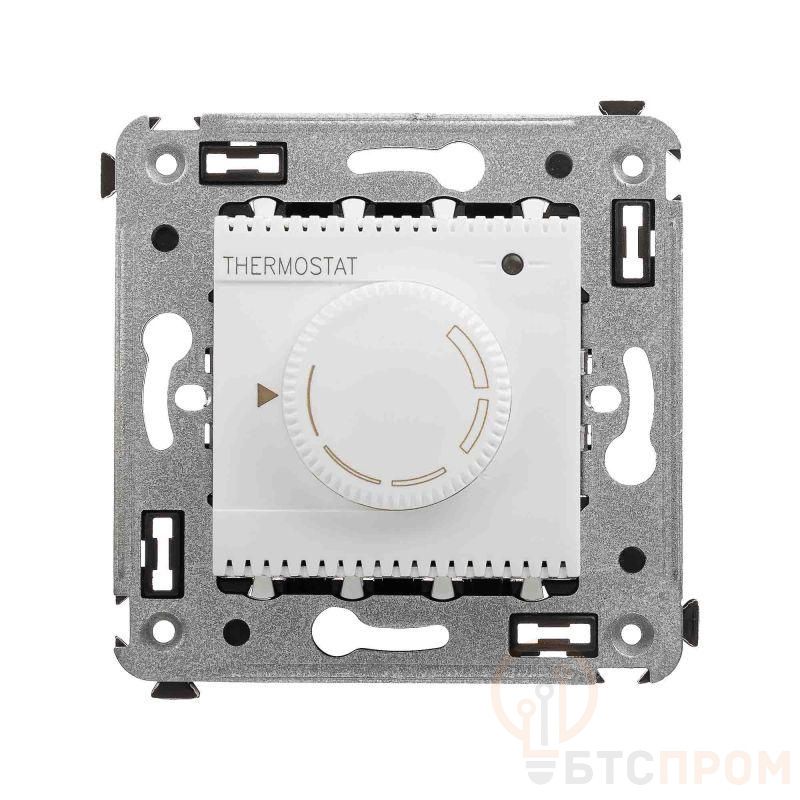 Термостат для теплых полов. Назначение: для монтажа в подрозеточные коробки глубиной не менее 45 мм (код 59301);. Предназначен для управления теплыми полами. Характеристики: диапазон от 5 до 30 °С; частота – 50–60 Гц; номинальное напряжение – 230 В; лампа-индикатор включается, когда температура в комнате падает ниже выбранного значения; нагрузка: 12 A – cos?=1; 4,8 A – cos?=0,4; фиксация в подрозеточные коробки глубиной не менее 45 мм при помощи каркаса с лапками (код 4400802) и саморезов; провод датчика температуры в комплекте (длина 3,5 метра). Цвет: "Белое облако". Производитель оставляет за собой право вносить во внешний вид изделия изменения, которые не влияют на его функционал, безопасность и надежность.