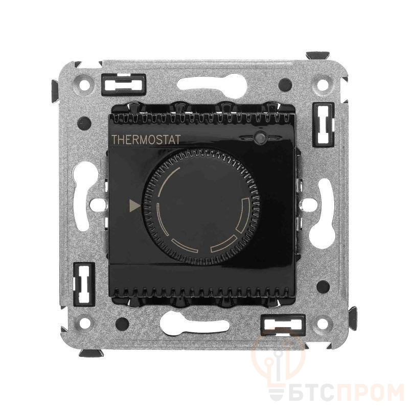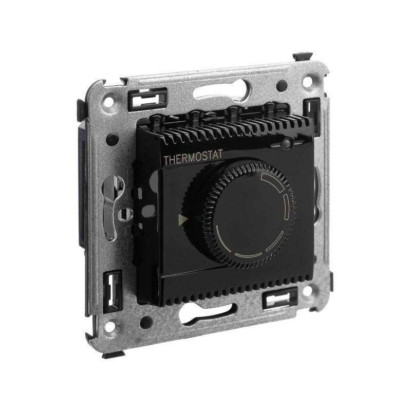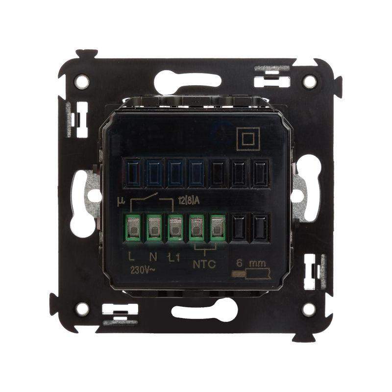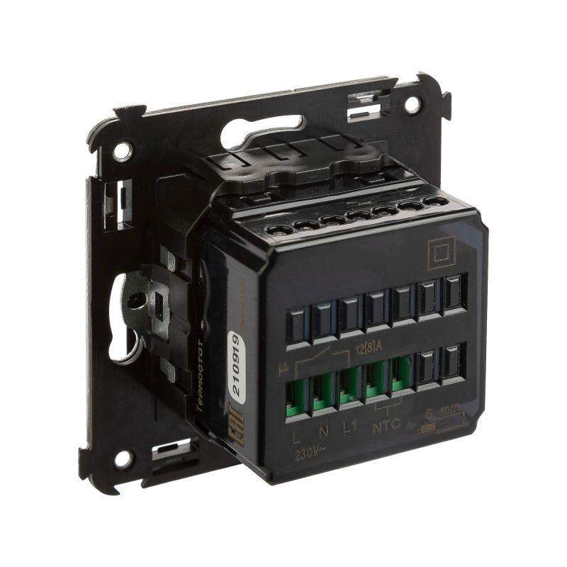 Термостат для теплых полов. Назначение: для монтажа в подрозеточные коробки глубиной не менее 45 мм (код 59301);. Предназначен для управления теплыми полами. Характеристики: диапазон от 5 до 30 °С; частота – 50–60 Гц; номинальное напряжение – 230 В; лампа-индикатор включается, когда температура в комнате падает ниже выбранного значения; нагрузка: 12 A – cos?=1; 4,8 A – cos?=0,4; фиксация в подрозеточные коробки глубиной не менее 45 мм при помощи каркаса с лапками (код 4400802) и саморезов; провод датчика температуры в комплекте (длина 3,5 метра). Цвет: "Черный квадрат". Производитель оставляет за собой право вносить во внешний вид изделия изменения, которые не влияют на его функционал, безопасность и надежность.