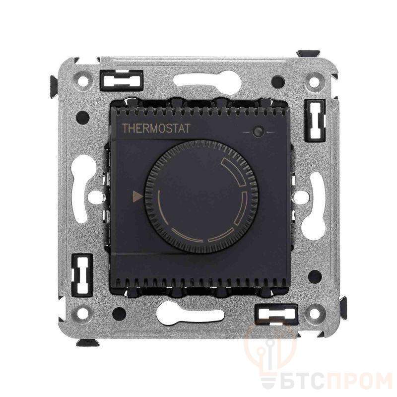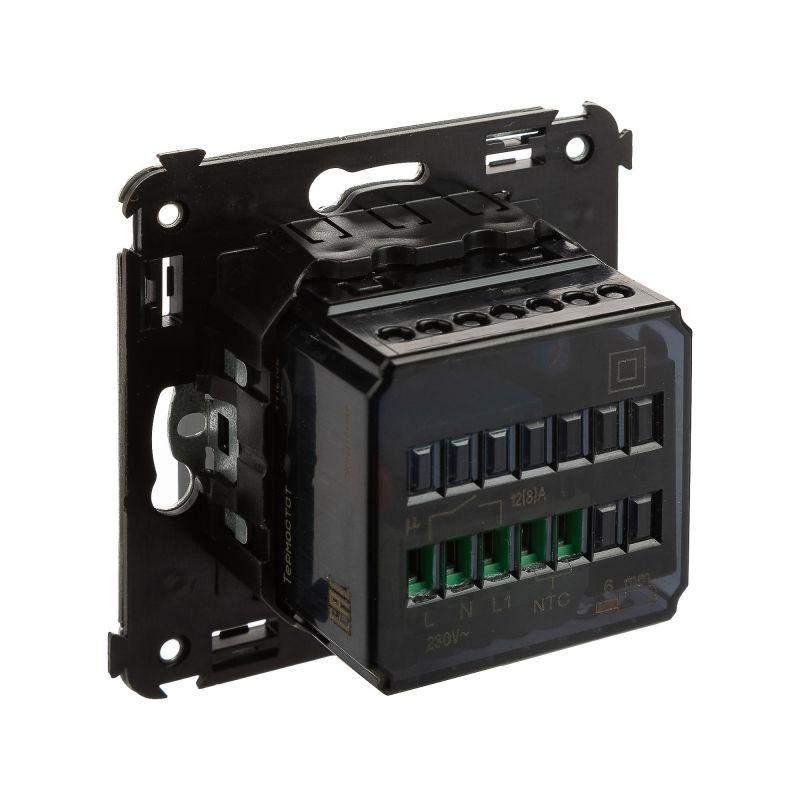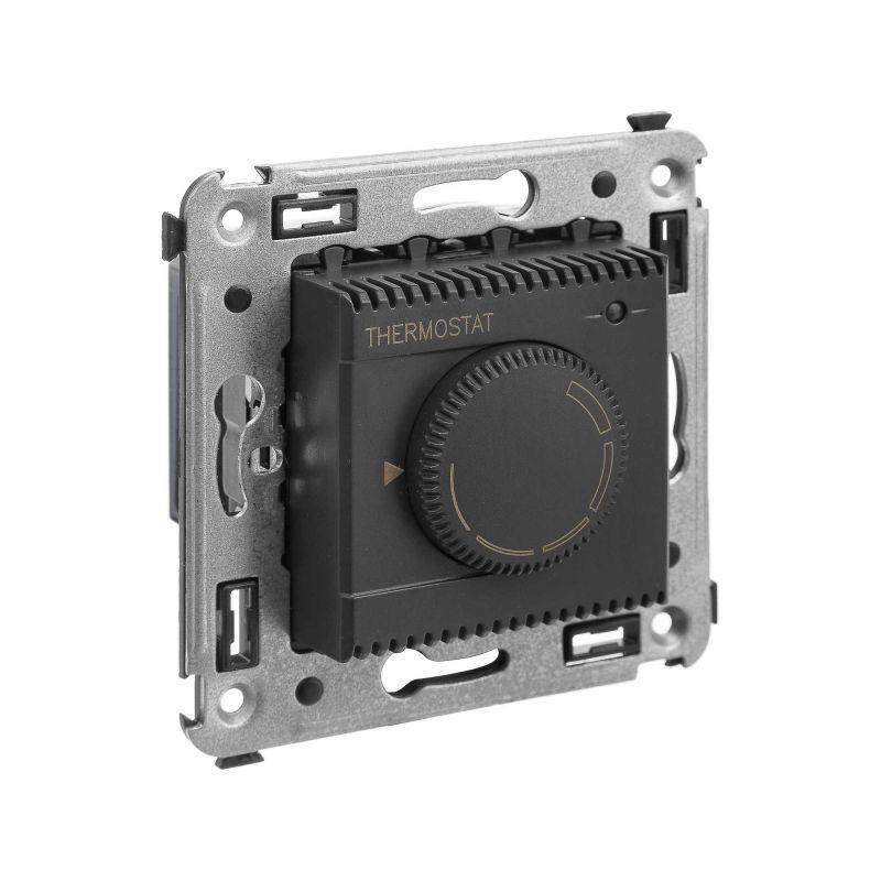 Термостат для теплых полов. Назначение: для монтажа в подрозеточные коробки глубиной не менее 45 мм (код 59301);. Предназначен для управления теплыми полами. Характеристики: диапазон от 5 до 30 °С; частота – 50–60 Гц; номинальное напряжение – 230 В; лампа-индикатор включается, когда температура в комнате падает ниже выбранного значения; нагрузка: 12 A – cos?=1; 4,8 A – cos?=0,4. Фиксация производится в подрозеточные коробки глубиной не менее 45 мм при помощи каркаса с лапками (код 4400802) и саморезов; провод датчика температуры в комплекте (длина 3,5 метра). 2 модуля. Цвет: "Черный матовый". Производитель оставляет за собой право вносить во внешний вид изделия изменения, которые не влияют на его функционал, безопасность и надежность.