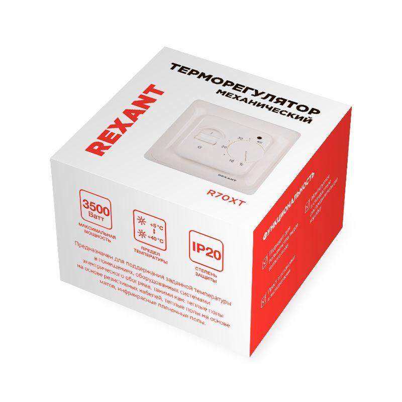 Механический термостат R70XT от REXANT белого цвета обеспечивает регулировку температуры в диапазоне от +5°C до +40°C. Имеет высокую коммутационную способность контактов до 16 А (3500 Вт), что позволяет использовать его для управления большим количеством электроприборов. Одним из преимуществ механического термостата является наличие выносного датчика температуры на проводе (устанавливается в зоне обогрева). Это позволяет точнее контролировать температуру в помещении и обеспечить комфортную атмосферу. Подходит для использования в различных областях, включая домашнее и офисное применение. Легко устанавливается и прост в использовании. Конструкция предусматривает механическое управление с помощью регулятора на корпусе.