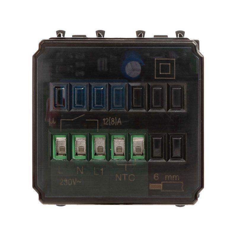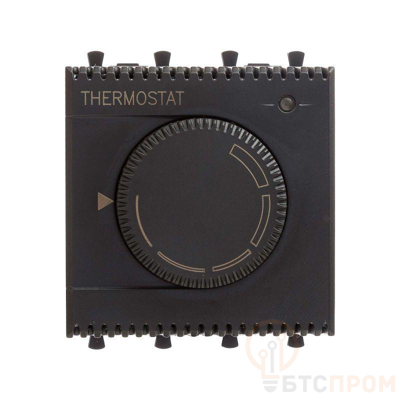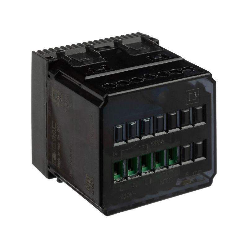 Термостат модульный для теплых полов. Назначение: для монтажа в систему пластиковых кабельных коробов "In-liner Front" и систему алюминиевых кабель-каналов, коробов и колонн "Aero" при помощи рамок-суппортов и каркасов "Avanti" (код 4400912 и т.д.). Используется для управления теплыми полами. Характеристики: диапазон от 5 до 30 °С; частота – 50–60 Гц; номинальное напряжение – 230 В; лампа-индикатор включается, когда температура в комнате падает ниже выбранного значения; нагрузка: 12 A – cos?=1, 2 A – cos?=0,4. Фиксация производится в подрозеточные коробки глубиной не менее 45 мм при помощи каркаса с лапками (код 4400802) и саморезов. 2 модуля. Цвет: "Черый матовый". Производитель оставляет за собой право вносить во внешний вид изделия изменения, которые не влияют на его функционал, безопасность и надежность.