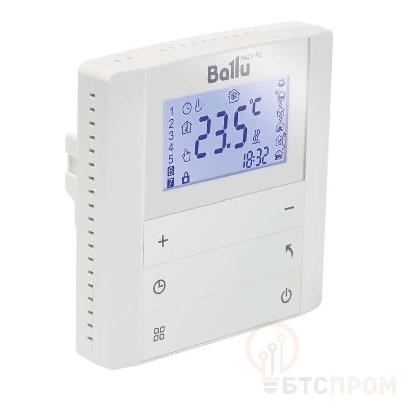 Многофункциональный цифровой программируемый терморегулятор (термостат) BALLU BDT-1 предназначен для поддержания заданной температуры в помещении, применяется совместно с климатической техникой – обогревателями, охлаждающими приборами, вентиляционным оборудованием. _x000D__x000D_Терморегулятор может работать в ручном, временном или полностью автоматическом режимах и позволяет устанавливать индивидуальную температуру для разных периодов времени для рабочих и выходных дней. Прибор оснащен большим жидкокристаллическим экраном с подсветкой. Максимальная коммутируемая нагрузка 16 А (~3,6 кВт). _x000D__x000D_Отличительные особенности_x000D__x000D_. Большой ЖК экран с подсветкой_x000D_. Простое удобное управление_x000D_Высокая точность 0,5 С_x000D_. Индикация времени 24 часа. _x000D_Программирование по дням недели и времени суток_x000D_Автоматический, полуавтоматический и ручной режим работы_x000D_. Управляет обогревателями и охлаждающими приборами_x000D_. Подключение до 16 А (3,6 кВт)_x000D_
