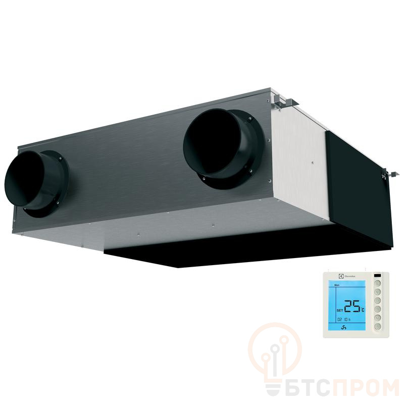 Приточно-вытяжная установка STAR это компактное рекуперативное устройство предназначено для подачи, очистки и удаления отработанного воздуха в помещения небольших объемов. Нагрев и увлажнение воздуха осуществляется без дополнительных затрат электроэнергии. Происходит это за счет пластинчатого рекуператора мембранного типа, который извлекая тепло и влагу из утилизированного воздуха, передает их поступающему воздуху с улицы. Монтаж установки можно осуществлять непосредственно в обслуживаемом помещении и подвесным потолком. Конструкция Стандартно установки комплектуются приточным и вытяжным вентиляторами, приточным и вытяжным фильтрами, пластинчатым рекуператором и системой автоматического управления с пультом дистанционного управления. Инновационный тип рекуператора позволяет подогревать и увлажнять приточный воздух, при этом специальная мембрана рекуператора переносит из вытяжного воздуха только молекулы воды, оставляя в нем все загрязнения. Вентиляторы установок оборудованы высокоэффективными крыльчатками с вперед загнутыми лопатками и асинхронными двигателями. Уплотненные шариковые подшипники двигателей не требуют техобслуживания и обеспечивают увеличенный срок службы. Защита двигателей вентиляторов осуществляется встроенными термоконтактами с автоматическим перезапуском при температуре 125С. В установке имеется две скорости вращения вентиляторов, возможность управления внешним электронагревателем (поставляется отдельно) и электронная защита рекуператора от обмерзания. При наличии протяженной сети воздуховодов в каналы приточного и (или) вытяжного воздуха последовательно устанавливаются дополнительные вентиляторы подпора (поставляются отдельно). Установка предназначена для монтажа непосредственно к круглым воздуховодам. Отличительные особенности: Встроенная система автоматики Самодиагностика ошибок Программируемый пульт управления с ЖК-дисплеем в комплекте Функция программирования недельного расписания работы установки КПД рекуператора до 85-90% при максимальном расходе воздуха Степень фильтрации EU5 Контроль загрязнения фильтра по времени наработки с изменяемым параметром Бесперебойная работа без обмерзания при температуре до -15С Два режима работы при температуре ниже -15С: Автоматический режим оттаивания рекуператора; Режим предотвращения обмерзания с подключением внешнего электронагревателя. Монтаж Приточно-вытяжная установка поставляется готовая к подключению. Установка монтируется горизонтально в подпотолочном пространстве. При монтаже необходимо обеспечить доступ для сервисного обслуживания установок. Не допускается: Bспользовать для транспортировки воздуха, содержащего "тяжелую" пыль, муку и т.д. Монтировать во взрыво-, пожароопасных помещениях и для транспортировки воздуха с содержанием паров пожароопасных веществ. Уход Регулярно очищайте фильтр в зависимости от загрязненности, особенно в мае-июне, в пору цветения. В этот период может требоваться очищать фильтр 2 и более раз в месяц. Для чистки фильтров и рекуператора не применяйте растворители и металлические щетки. Для удаления пыли пользуйтесь мягкой щеткой. Проверка надежности электрических соединений производится не реже 1 раза в год. Гарантия 24 месяца.