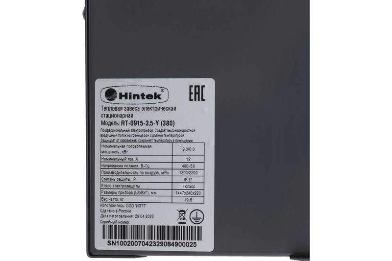 Завеса тепловая 9кВт RT-0915-3.5-Y (380) HINTEK 04.03.01.214410 фото в каталоге от BTSprom.by