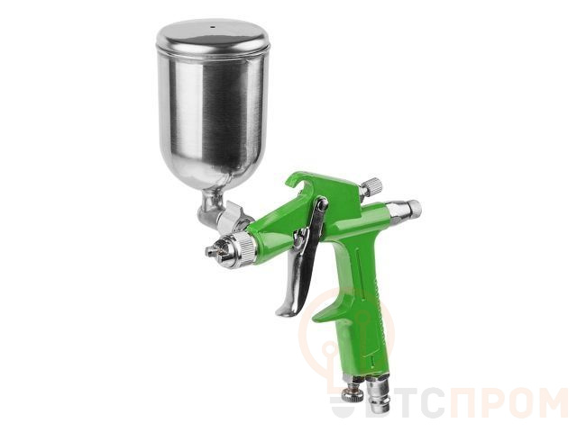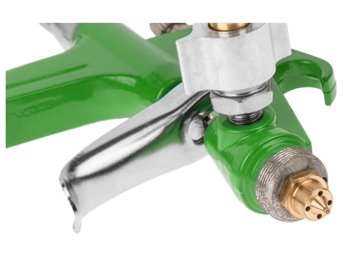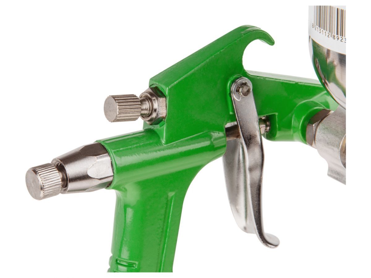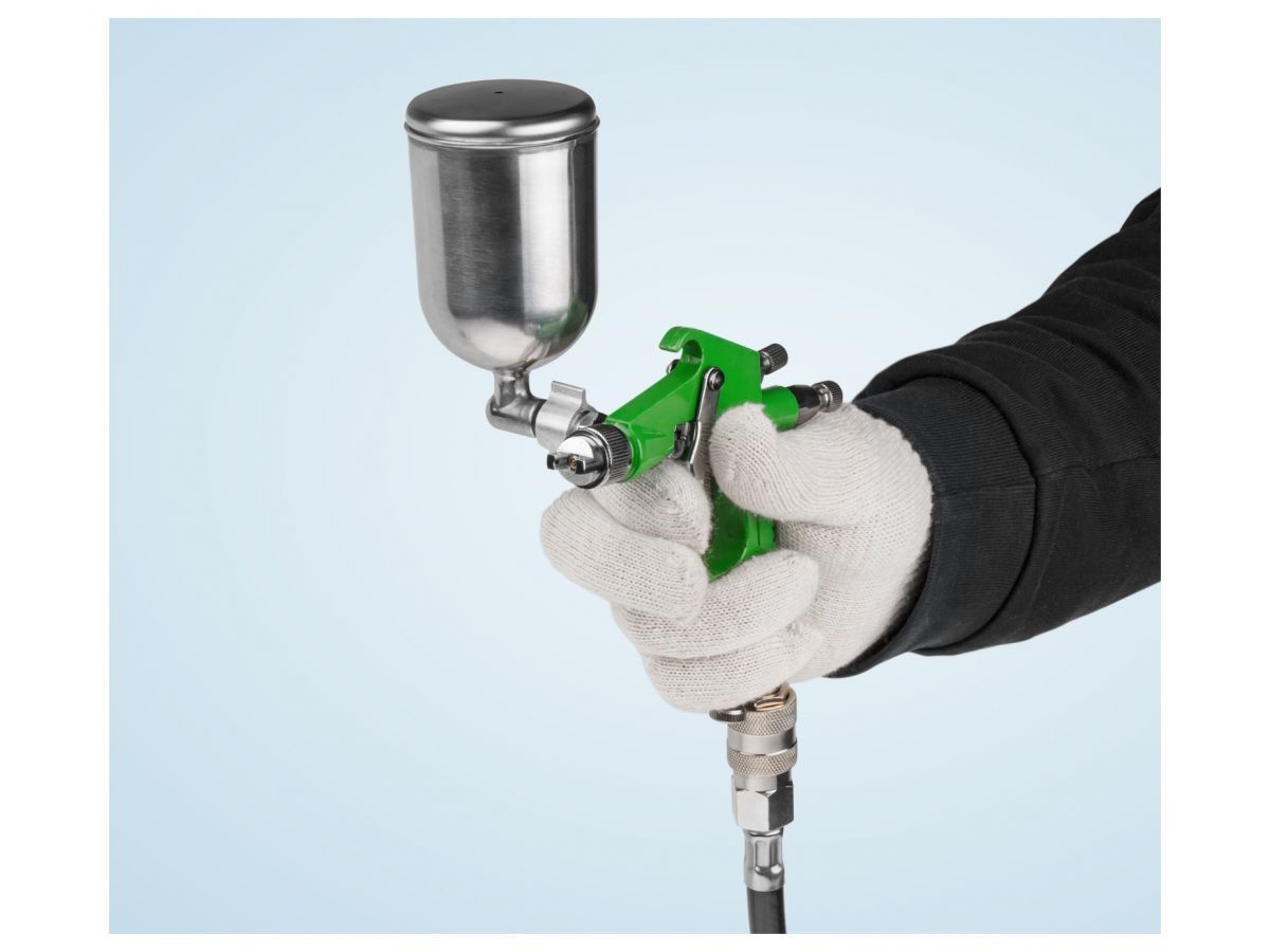 Компактный краскораспылитель типа HVLP с поворотным металлическим бачком разработан для работ в труднодоступных местах. За счет изменения положения бачка материал можно наносить на поверхности в разных плоскостях.