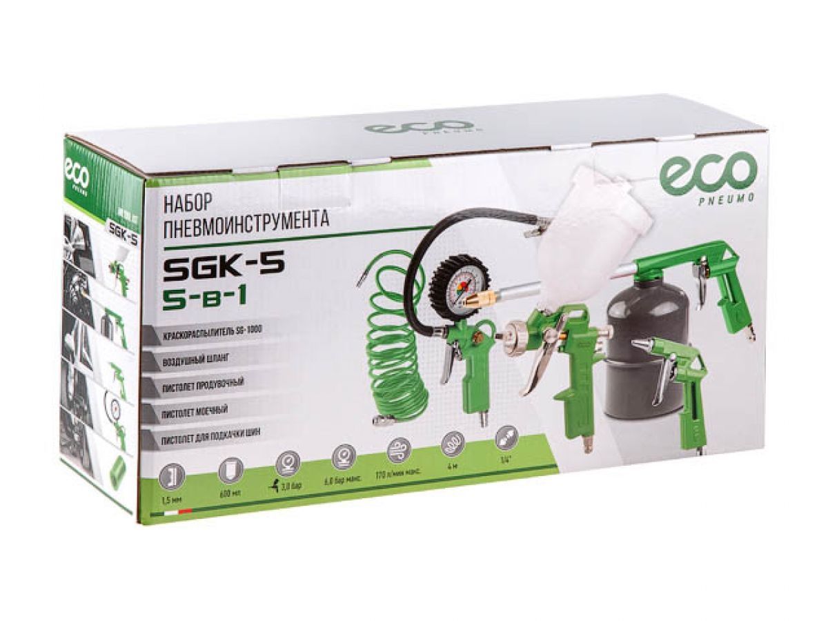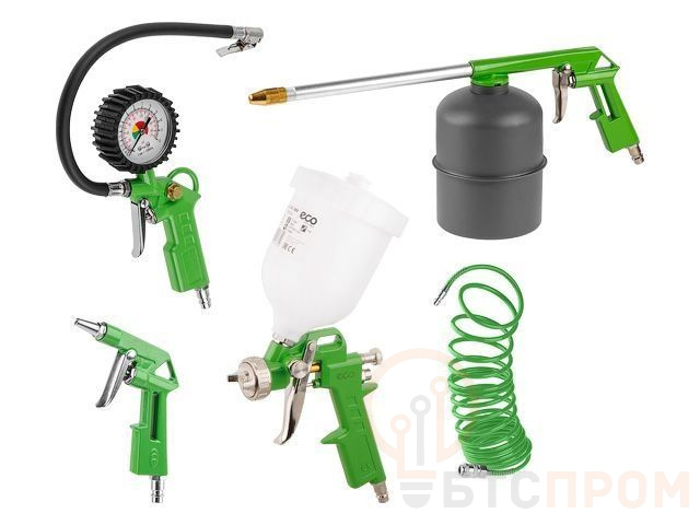 Базовый набор пневмоинструментов, состоящий из популярных компонентов, которые пригодятся начинающему пользователю воздушного компрессора. В набор входит краскораспылитель типа HVLP, пистолет моечный для мойки поверхностей моющими составами, пистолет для подкачки шин с манометром, продувочный пистолет для очистки поверхностей от пыли и сухой грязи и спиральный пневматический шланг для подключения аксессуаров к компрессору.