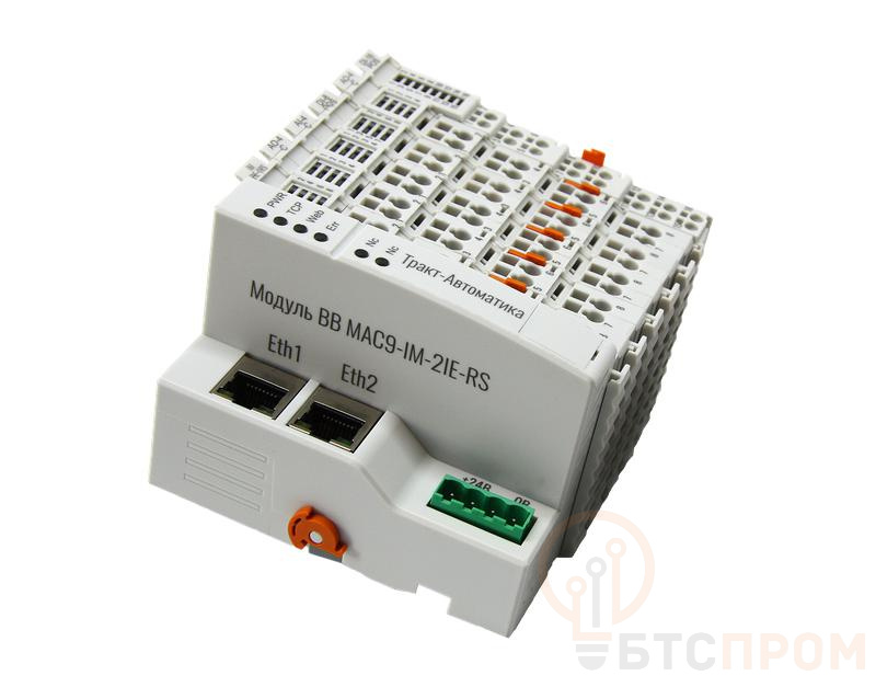 "Модуль ввода-вывода разработан и изготовлен ООО «Тракт-Автоматика». Это устройство, используемое в системах удаленного доступа для увеличения числа каналов поступающей информации, а также числа каналов для исходящей информации и сигналов управления. Интерфейсный блок модуля MAC9-IM-2IE-RS может выполнять ряд дополнительных задач, необходимых в ходе работы системы таких как: контроль напряжения питания, калибровка и линеаризация показаний датчиков, диагностика и др. Устройство состоит из интерфейсного модуля с базовыми портами ввода/вывода и наборными модулями расширения. Интерфейсный модуль поддерживает интерфейсы RS-485 и два Ethernet. Второй порт Ethernet работает в режиме Switch и позволяет использовать одну линию для подключения нескольких устройств в одну физическую сеть. Модули расширения позволяют увеличить количество портов необходимого типа в требуемом количестве. Поддержка Modbus RTU и Modbus TCP позволяет станции легко интегрироваться с большинством производимых контроллеров. Конфигурирование всех присоединенных модулей доступно через Web-интерфейс. Станция поддерживает подключение до 32 MAC модулей. Модули конфигурируются в зависимости от потребности количества и вида портов.