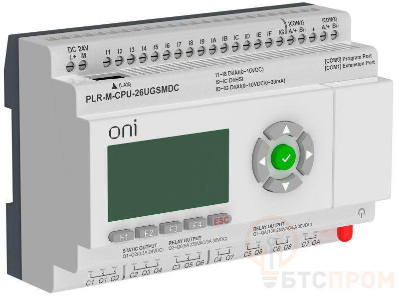 Модуль ЦПУ микро ПЛК ONI с возможностью расширения количества каналов ввода-вывода и коммуникаций с помощью модулей расширения ONI PLR-S. С интегрированным полнофункциональным экраном, 16 дискретными входами, из которых 4 можно использовать как аналоговые 0-20мА, 8 как аналоговые 0-10В и 4 как высокоскоростные счетчики до 60кГц, 2 транзисторными выходами с возможностью ШИМ/позиционирования до 10кГц и 8 релейными выходами. Архивация данных процесса при использовании стандартной SD карты. Интегрированы 2 интерфейса RS485 и 1 интерфейс Ethernet с поддержкой Modbus TCP/RTU/ASCII и MQTT протоколов. Поддержка 2G/4G/GSM сетей и отправки e-mail сообщений. Предназначен для управления автоматизированным оборудованием. Напряжение питания 24В DC.