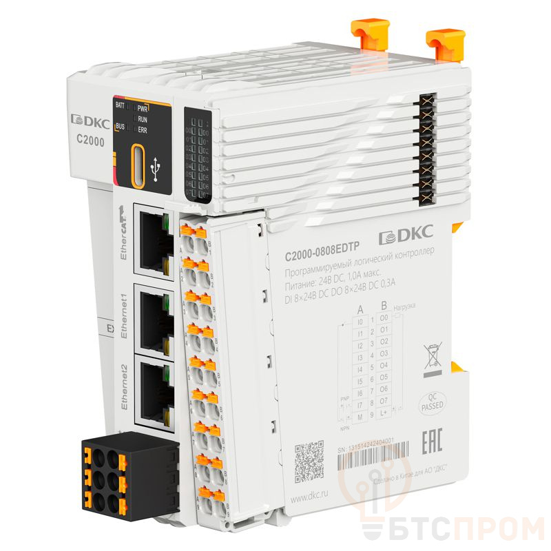 Модуль процессорный программируемого логического контроллера C2000 24В DC; 8 DI - 24В DC; 8 DO - 24В DC(PNP); 1хRS485; 2хEthernet; 1хEtherCAT; 1хType-C; 2 модуля расширения моноблока (BD) DKC C2000-0808EDTP