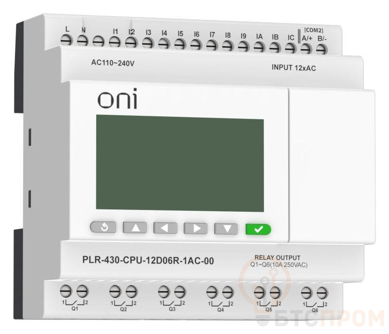 Модуль ЦПУ ПЛК 430 ONI с возможностью расширения количества каналов ввода-вывода и коммуникаций с помощью модулей расширения. С интегрированным полнофункциональным экраном. 12 дискретных входов и 6 релейных выходов. Интегрированы 1 интерфейс RS485 и 1 интерфейс RS232. Напряжение питания 220В AC.