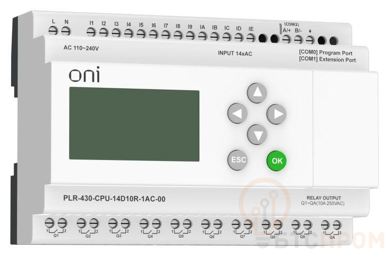 Модуль ЦПУ ПЛК 430 ONI с возможностью расширения количества каналов ввода-вывода и коммуникаций с помощью модулей расширения. С интегрированным полнофункциональным экраном. 14 дискретных входов, 10 релейных выходов. Интегрированы 1 интерфейс RS485 и 1 интерфейс RS232. Напряжение питания 220В AC.