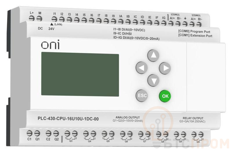 Модуль ЦПУ ПЛК 430 4 DI 12 UI (0-10В/DI) 8 RO 2 AO (1шт 0-10В и 1шт 0-20мА) 24В DC с Ethernet портом с экраном ONI PLC-430-CPU-16U10U-1DC-00