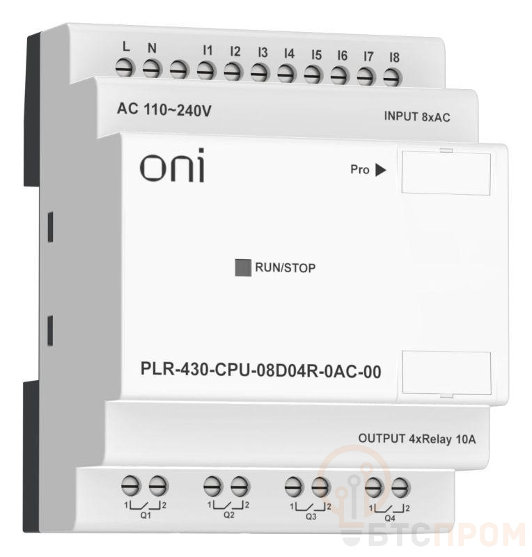Модуль ЦПУ ПЛК 430 ONI без возможности расширения количества каналов ввода-вывода и коммуникаций. Без встроенного экрана. 8 дискретных входов и 4 релейных выхода. Интегрирован 1 интерфейс RS232. Напряжение питания 220В AC.
