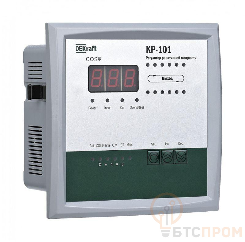Регуляторы реактивной мощности серии КР-101 — это специальный контроллер для компенсации реактивной мощности в низковольтной системе распределения электроэнергии, который определяет коэффициент мощности в сети и в зависимости от его значения производит автоматическое включение или отключение конденсаторных батарей для обеспечения требуемого коэффициента мощности. Напряжение катушки управляемого контактора 220 В, 8 ступеней регулирования.
