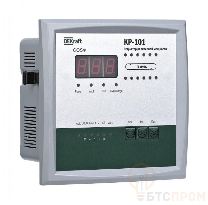Регуляторы реактивной мощности серии КР-101 — это специальный контроллер для компенсации реактивной мощности в низковольтной системе распределения электроэнергии, который определяет коэффициент мощности в сети и в зависимости от его значения производит автоматическое включение или отключение конденсаторных батарей для обеспечения требуемого коэффициента мощности. Напряжение катушки управляемого контактора 380 В, 4 ступеней регулирования.